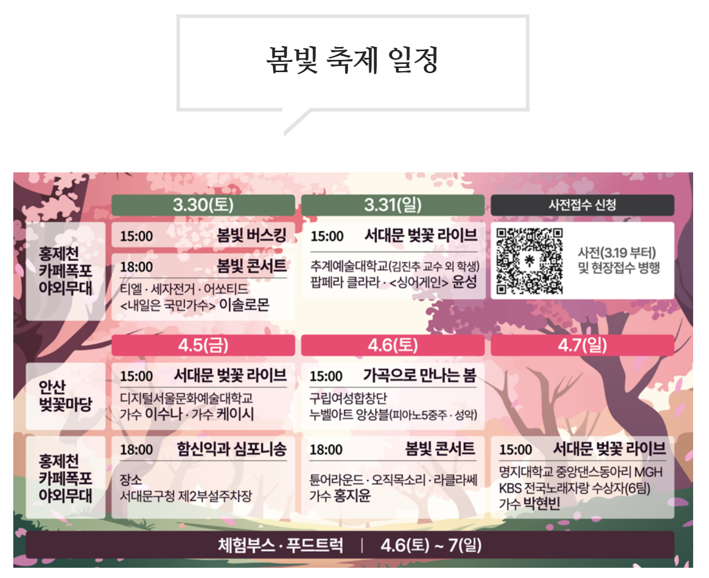 서대문구(구청장 이성헌)도 오는 30일부터 31일까지, 다음 달 5일에서 7일까지 닷새간 서대문 안산과 홍제천 일대에서 ‘봄빛 서대문에서 만나 봄’ 축제를 개최합니다.‘안산’은 봄마다 장관을 이루는 벚꽃으로, ‘홍제천’은 홍제폭포로 잘 알려진 서대문구 명소입니다.*공연 및 축제 - 가수 케이시, 박현빈 등 대중가수들의 공연과 ‘함신익과 심포니송 오케스트라’ 등 클래식 공연*주말인 4월 6일부터 7일까지는 홍제천 일대에 벚꽃공방, 체험부스, 푸드트럭이 마련된다고 합니다.