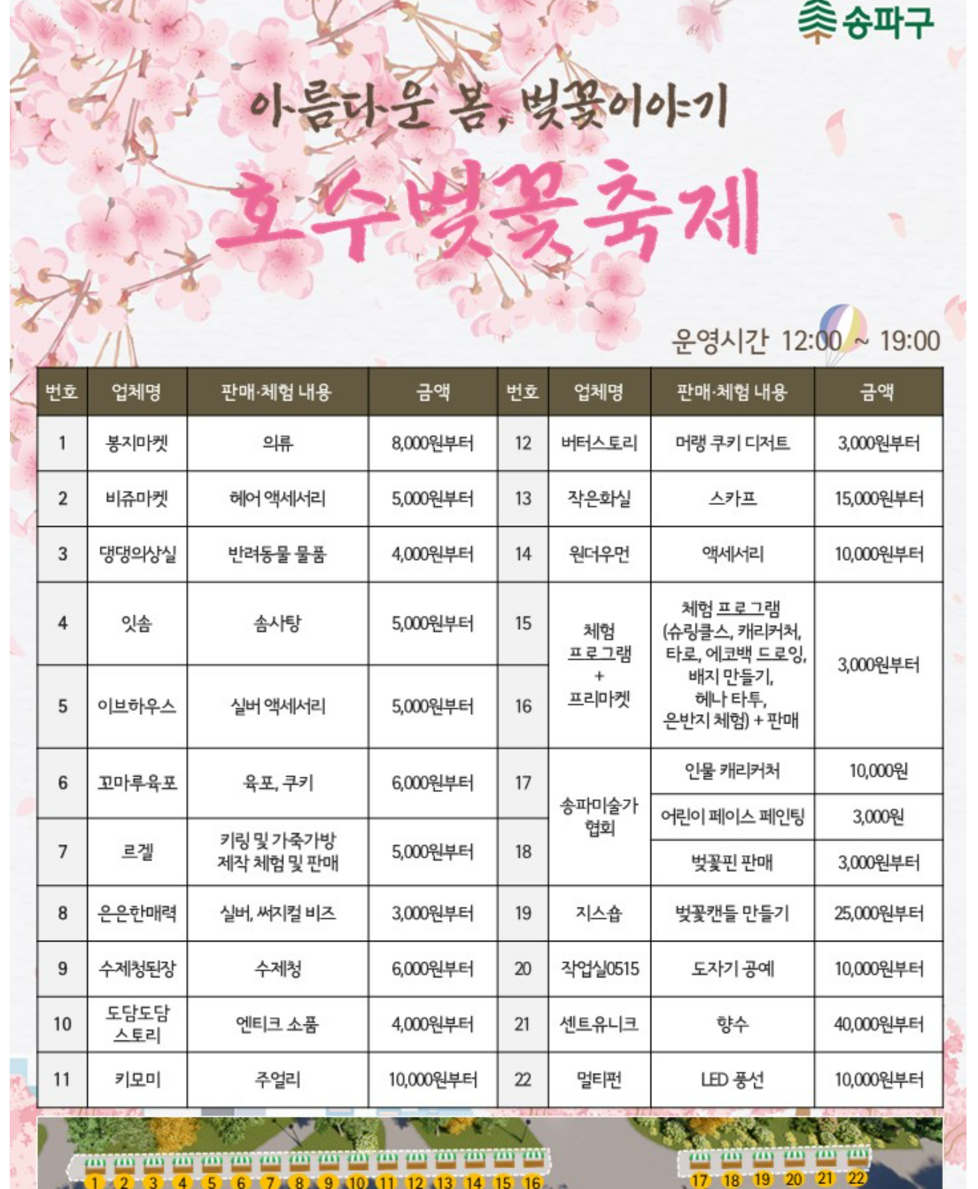 석촌호수 벚꽃축제 송파구(구청장 서강석)는 여의도 벚꽃축제와 함께 양대산맥으로 꼽히는 ‘석촌호수 벚꽃축제’를 오는 27일부터 31일까지 열립니다.